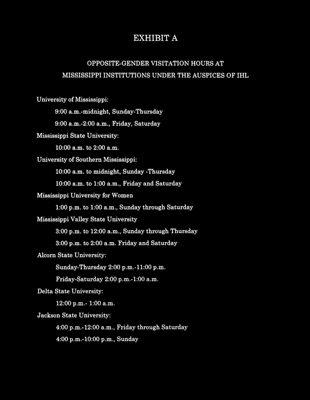 I state my bona fides so that you will understand the sincerity of my heartfelt concern about a very disturbing policy in place now at Ole Miss and every other public college and university throughout our beloved Mississippi. This extremely dangerous policy which is presently in force is that of allowing opposite-gender visitation in dormitory rooms for long hours each day---and far into the night. As a result of this policy, mothers with daughters at Ole Miss or other state schools with similar policies have told me horrifying stories, and I am just one grandmother.