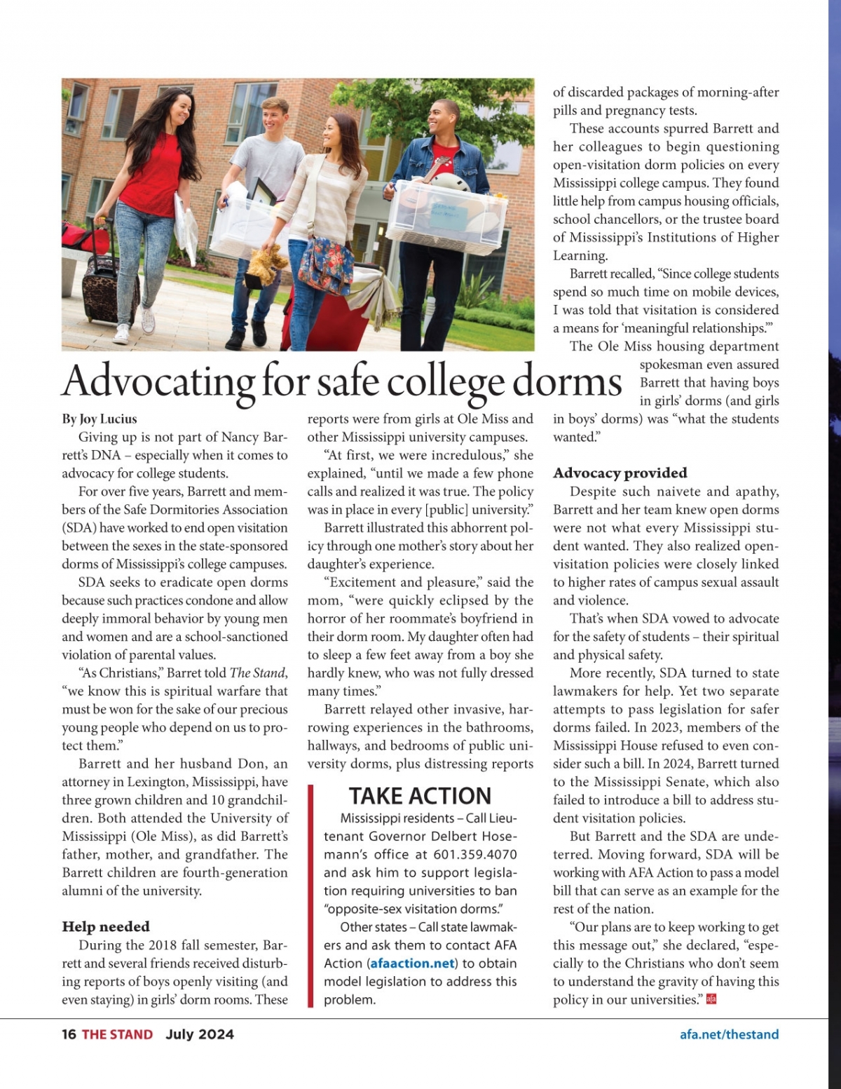 For over five years, Barrett and members of the Safe Dormitories Association (SDA) have worked to end open visitation between the sexes in the state-sponsored dorms of Mississippi’s college campuses.